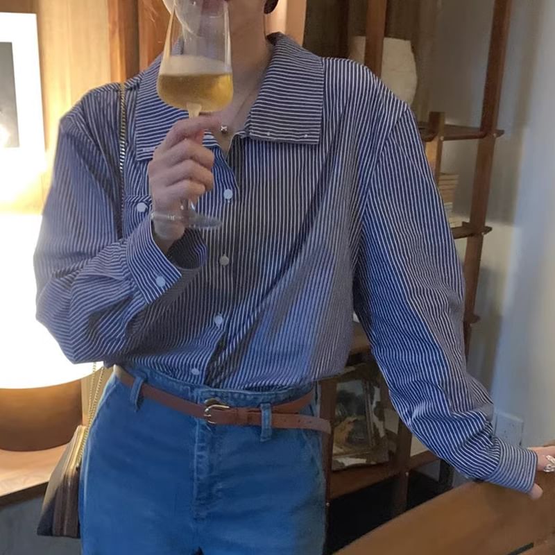 Long Sleeve Stand Collar Striped Button Up Shirt