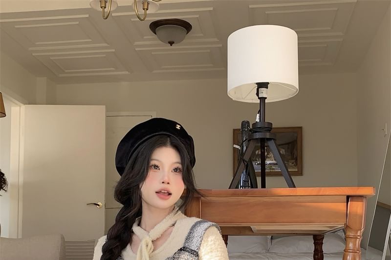 Long Sleeve Tie Neck Plain Pom Pom Top / Plaid Maxi A-Line Dungaree Dress