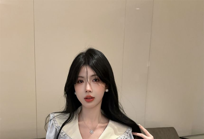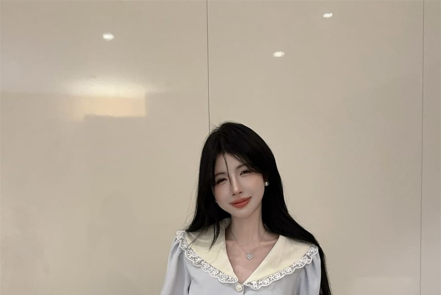 Long-Sleeve Two Tone Lace Trim Shirt / High Waist Tiered Mini A-Line Skirt