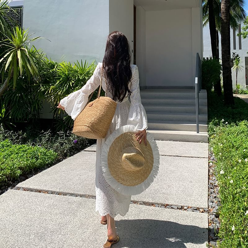 Long-Sleeve V-Neck Plain Slit Midi A-Line Eyelet Lace Dress