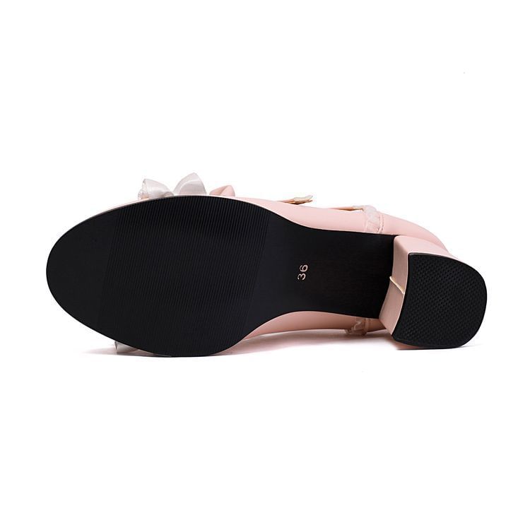 Chunky Heel Ankle Strap Faux Pearl Bow Frill Trim Mary Jane Pumps