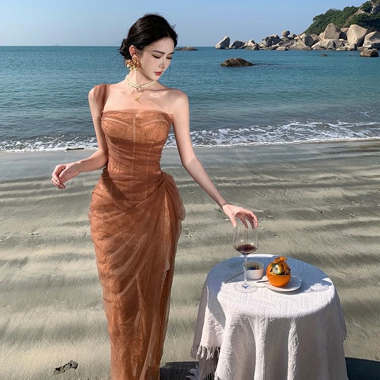 Maxi Sleeveless Evening One Ruffle Shoulder Sheer Sequin Gown