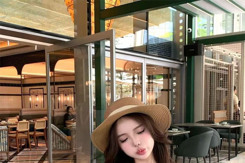 Short-Sleeve Scoop Neck Bow Slim Fit T-Shirt / Elastic Waist Floral Midi A-Line Skirt