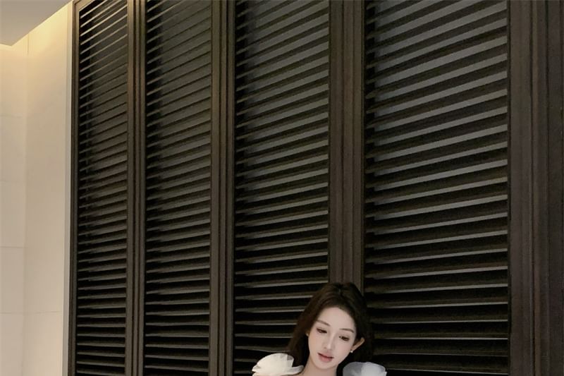 Spaghetti Strap Plain Flower Detail Mesh Mini Sundress