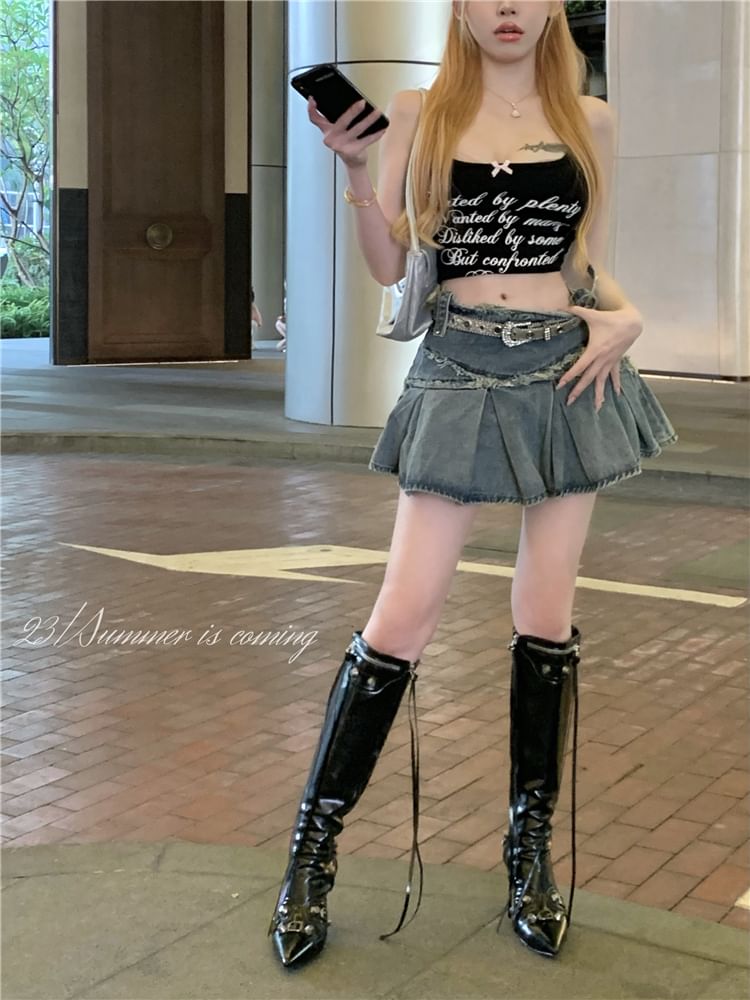Mini Mid Rise Skirt Tassel Washed A-Line Denim Trim