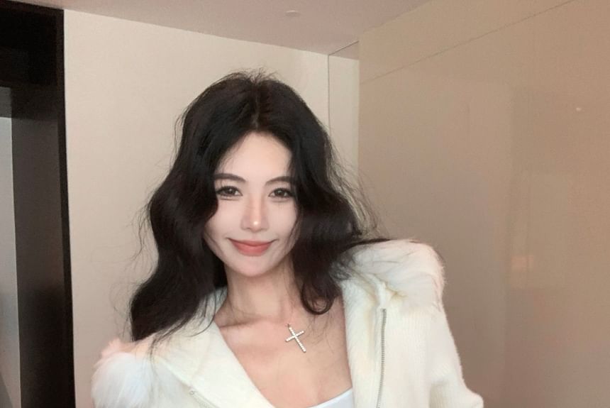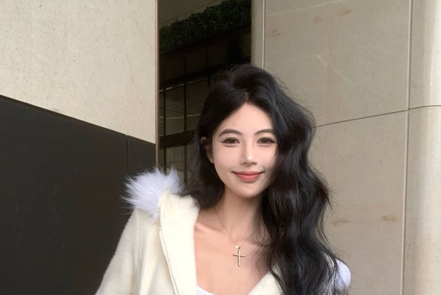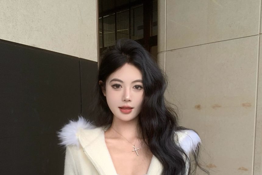 Plain Fluffy Trim Zip-Up Knit Hoodie / Drawstring Waist Mini Pencil Skirt
