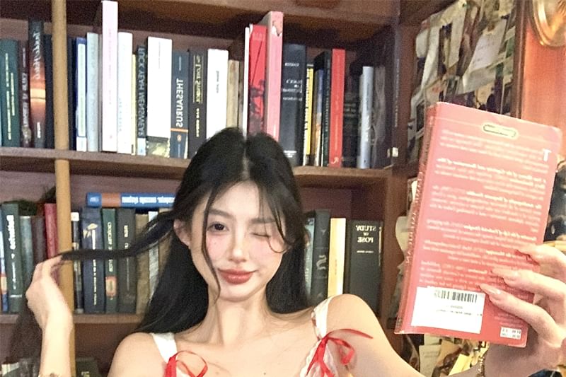 Spaghetti Strap Plaid Lace Trim Bow Mini Bodycon Dress