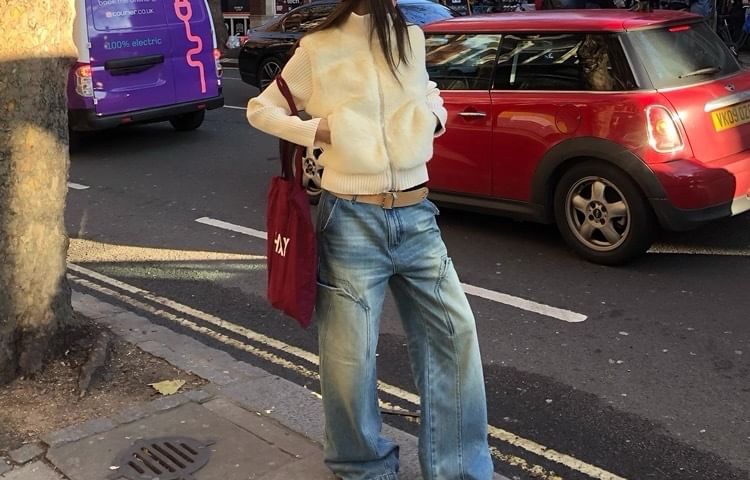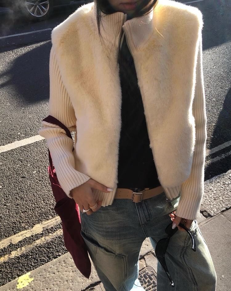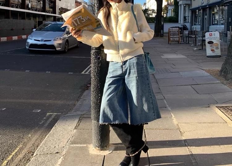 Mock Two-Piece Turtleneck Plain Fleece Panel Ribbed Zip Cardigan