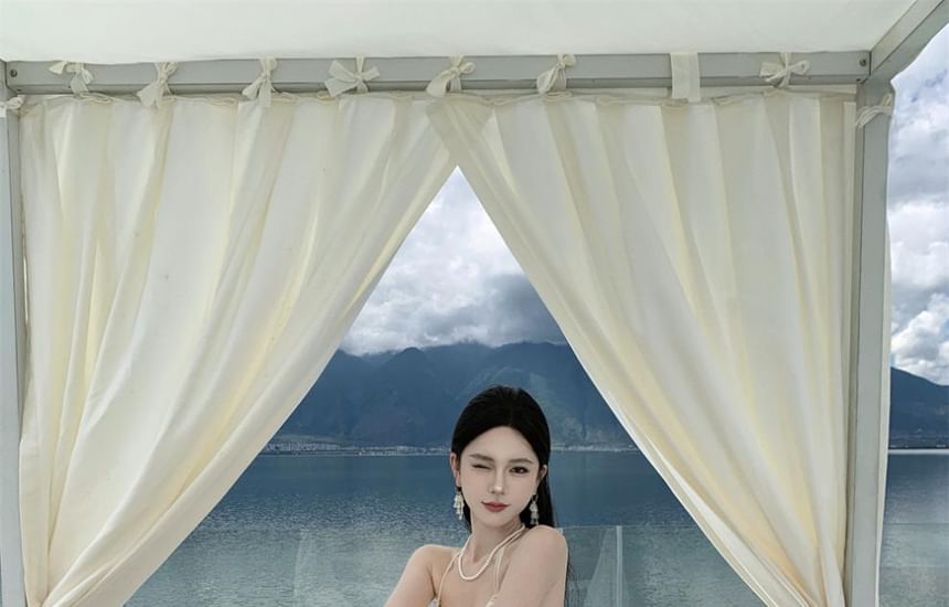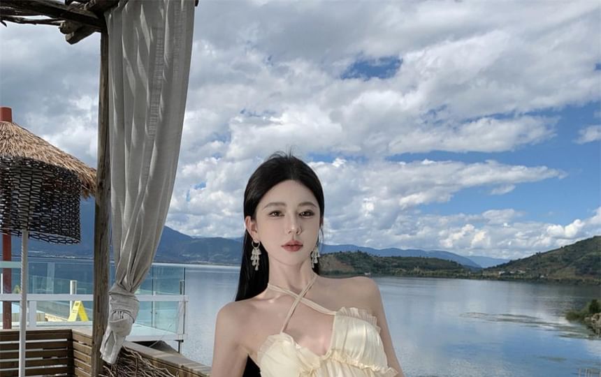 Halter Neck Plain Asymmetrical Frill Trim Ruffle Open Back Maxi A-Line Dress