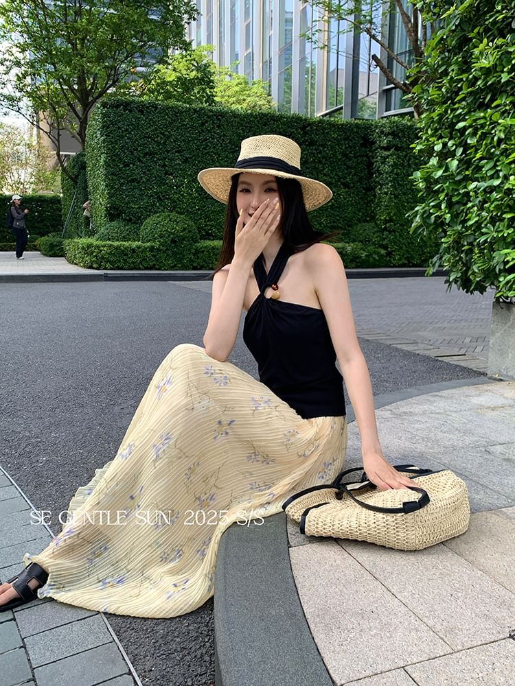 Halter Neck Plain Slit Crop Camisole Top