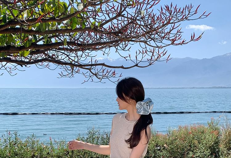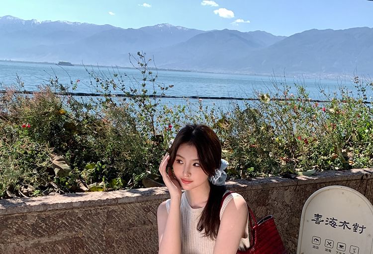 Neck Top Sleeveless Plain Knit Ribbed Crew