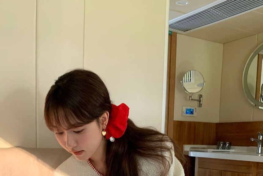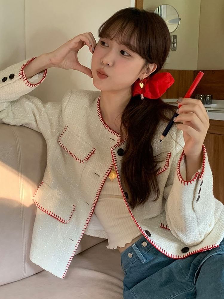 Crew Neck Contrast Stitched Button-Up Tweed Crop Jacket