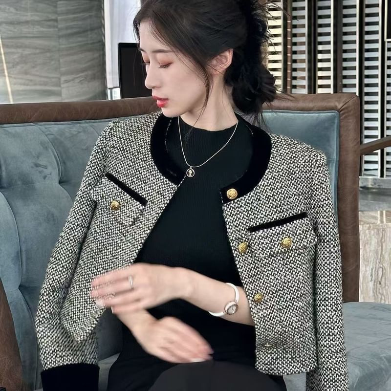 Crew Neck Contrast Trim Button-Up Tweed Crop Jacket