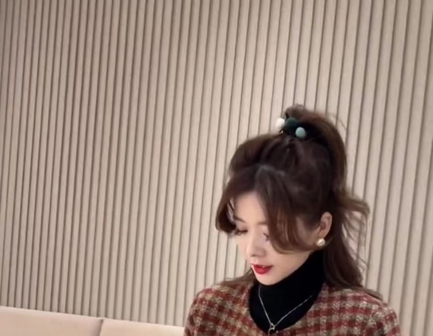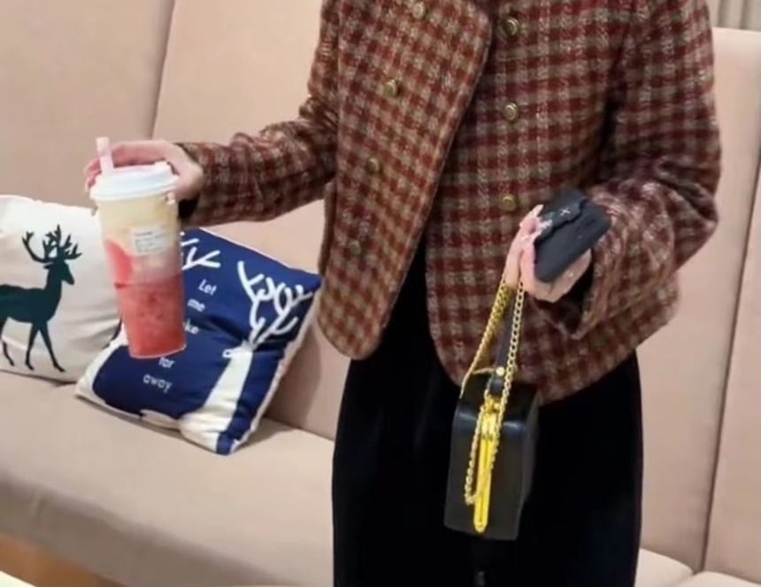 Crew Neck Houndstooth Tweed Double Breasted Cropped Jacket