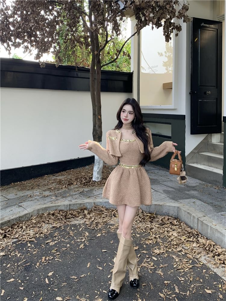 Set: Tweed Crop Open Front Jacket + Spaghetti Strap Crop Bustier Top + Mid Rise Mini A-Line Skirt
