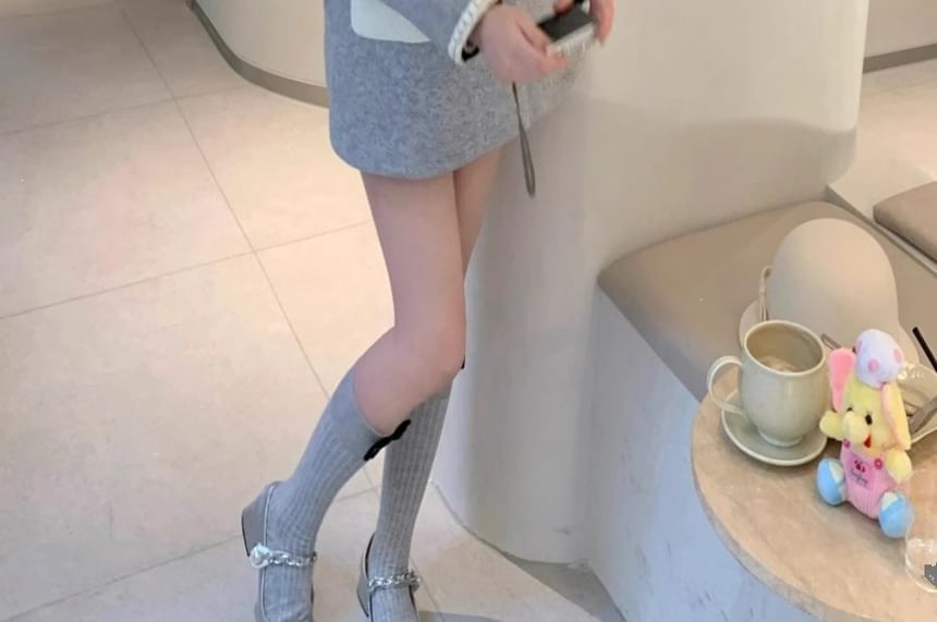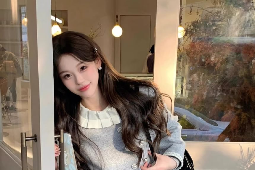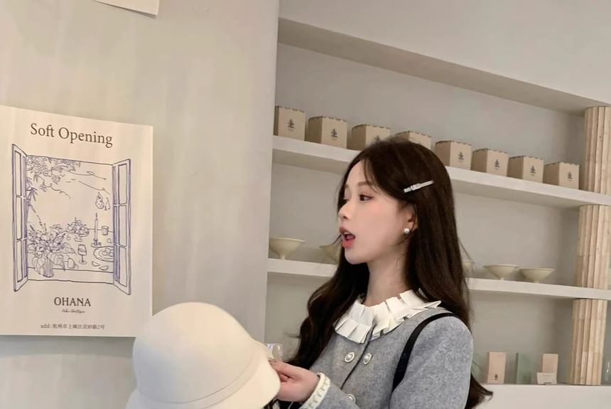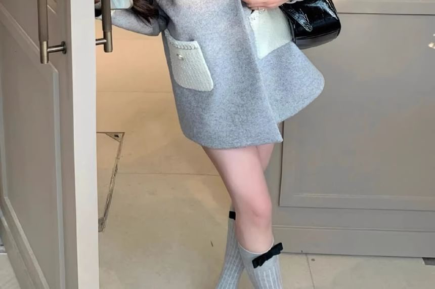 Stand Collar Two Tone Tweed Panel Frill Trim Double-Breasted Coat