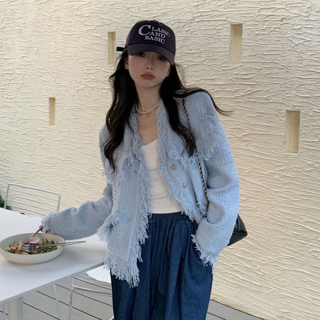 V-Neck Fringed Button-Up Plain Tweed Jacket