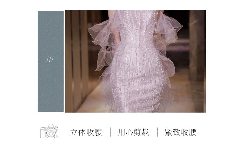 Off-Shoulder Sequin Mesh Panel Faux Pearl Accent Mermaid Evening Gown
