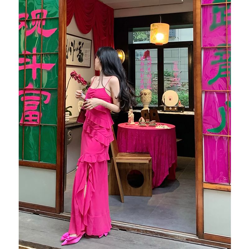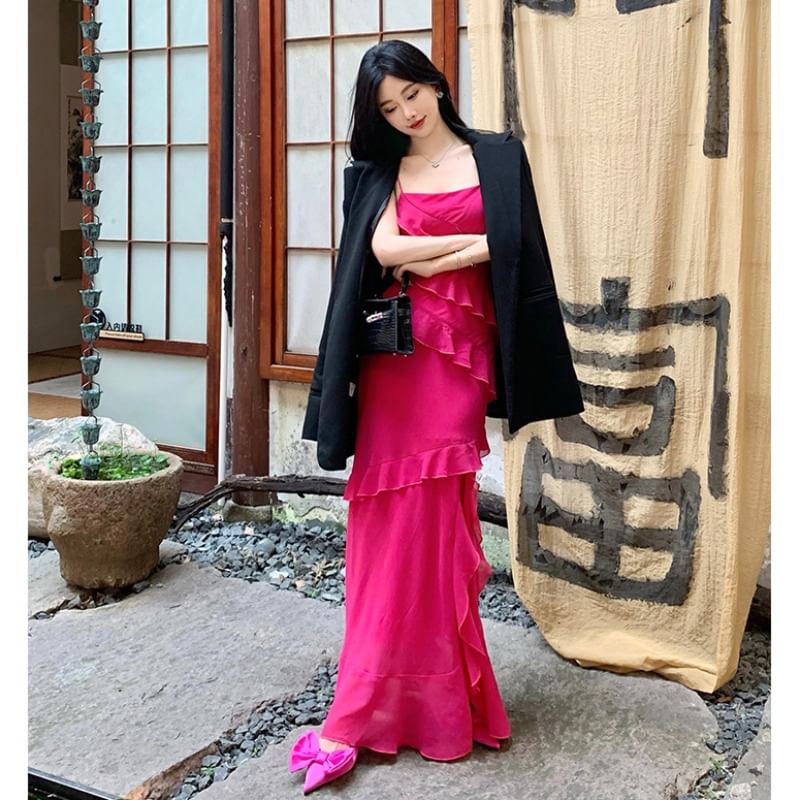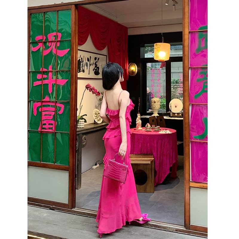 One Shoulder Asymmetrical Plain Ruffled Midi A-Line Dress