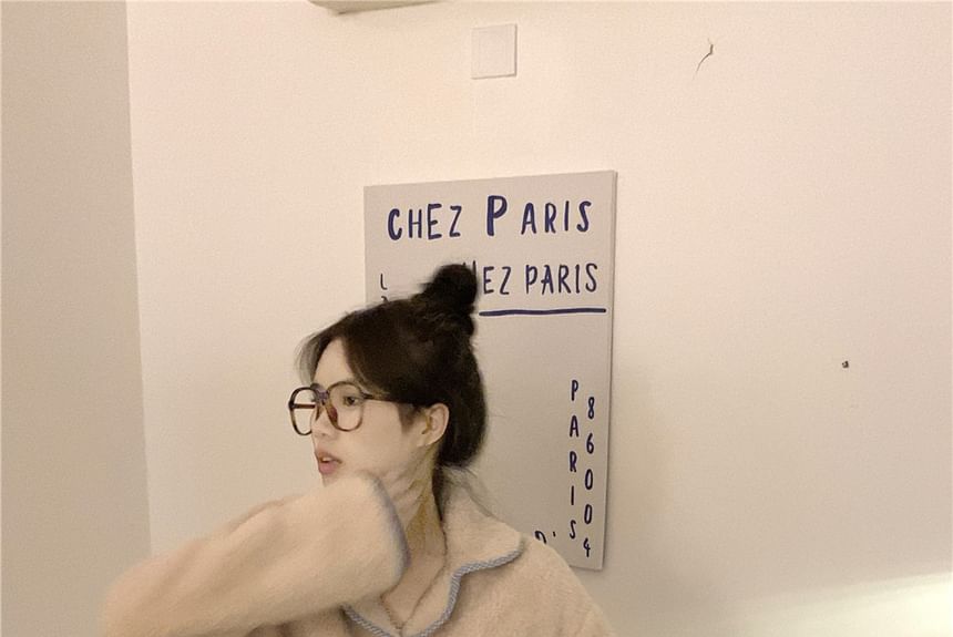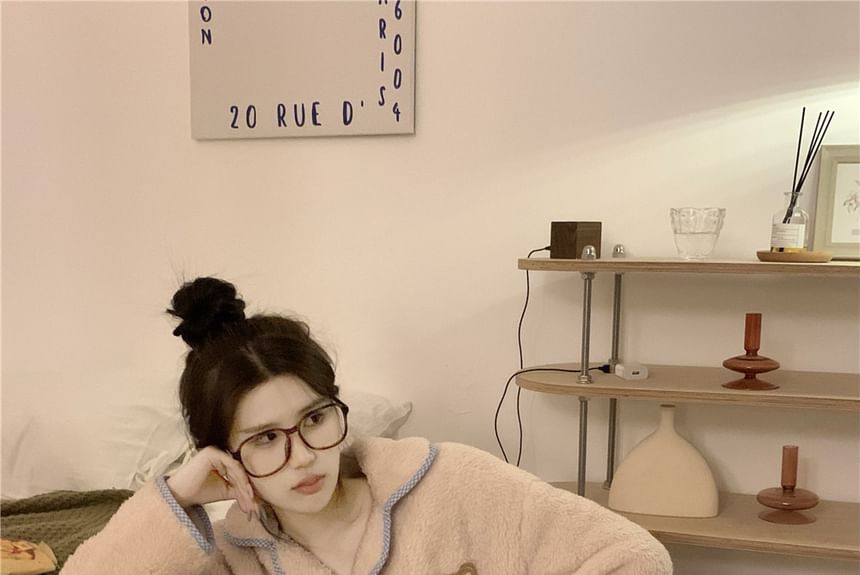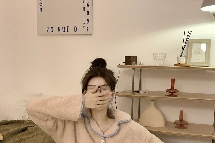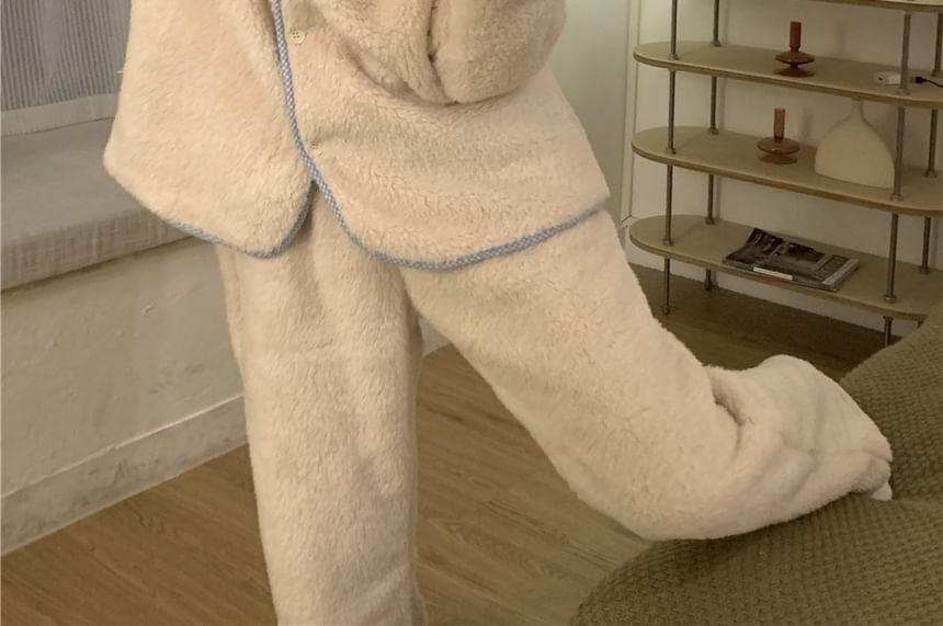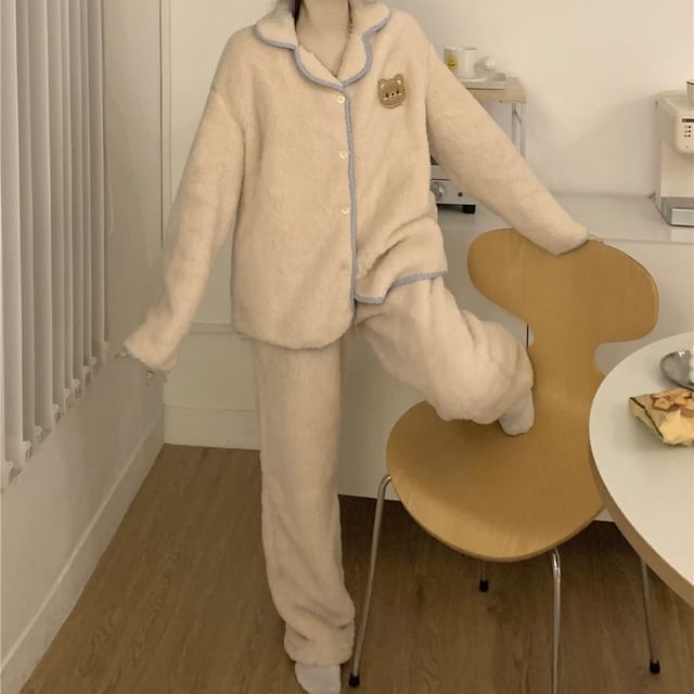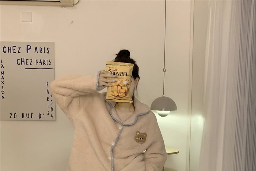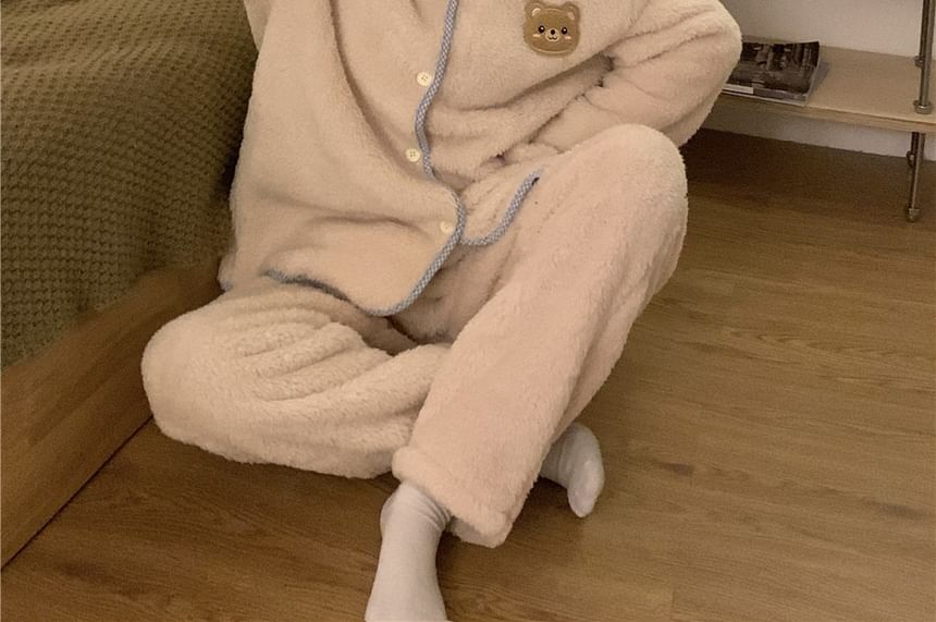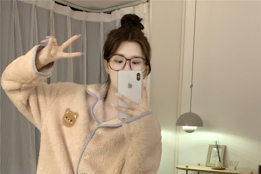Pajama Set: Bear Embroidered Coral Fleece Button-Up Top + Pants