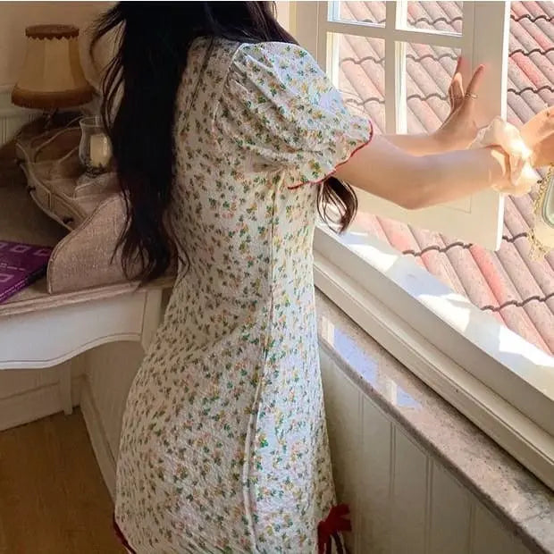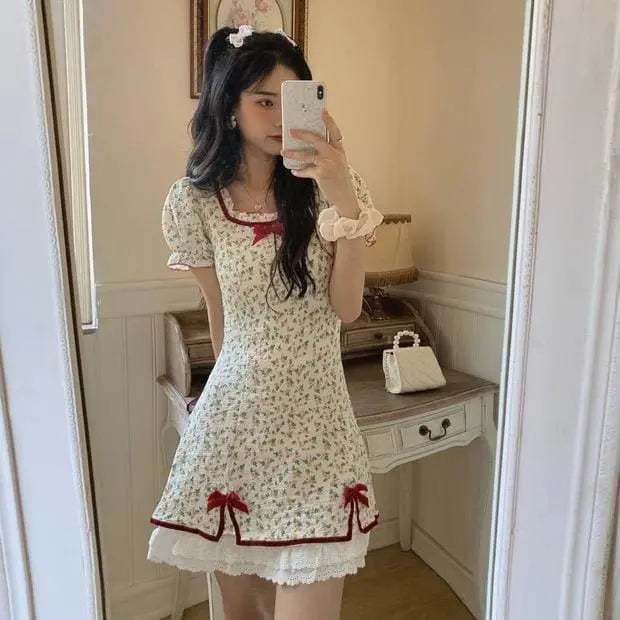 'Petal Forest' Kawaii Princess Floral Cottage Mini Dress with red bow decoration, puff sleeves and ruffles.