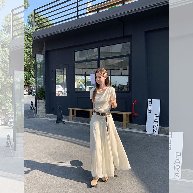 Plain Fit Neck Cowl Short-Sleeve T-Shirt Slim Ruched