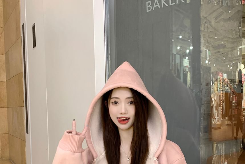 Plain Fleece-Lined Zip Hoodie / Long Sleeve Halter Plain Mock Two Piece T-Shirt / Drawstring Waist Striped Wide Leg Pants