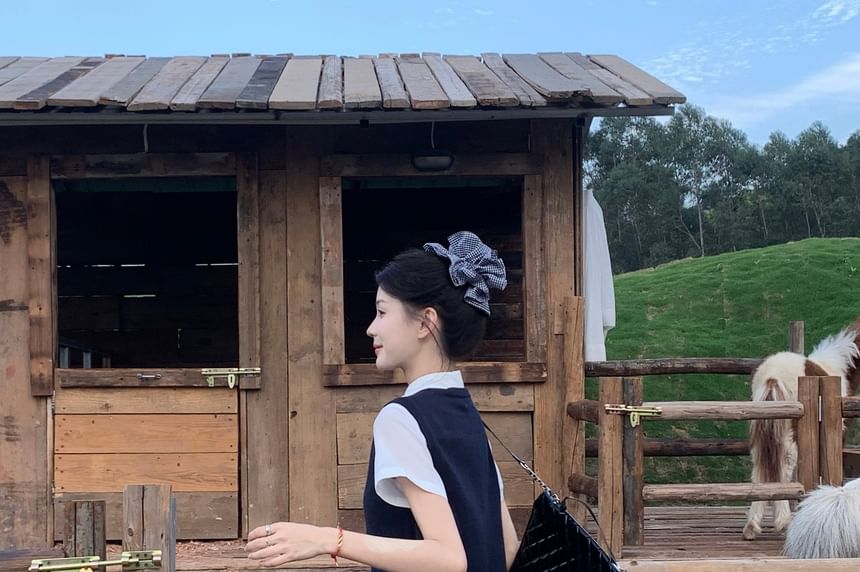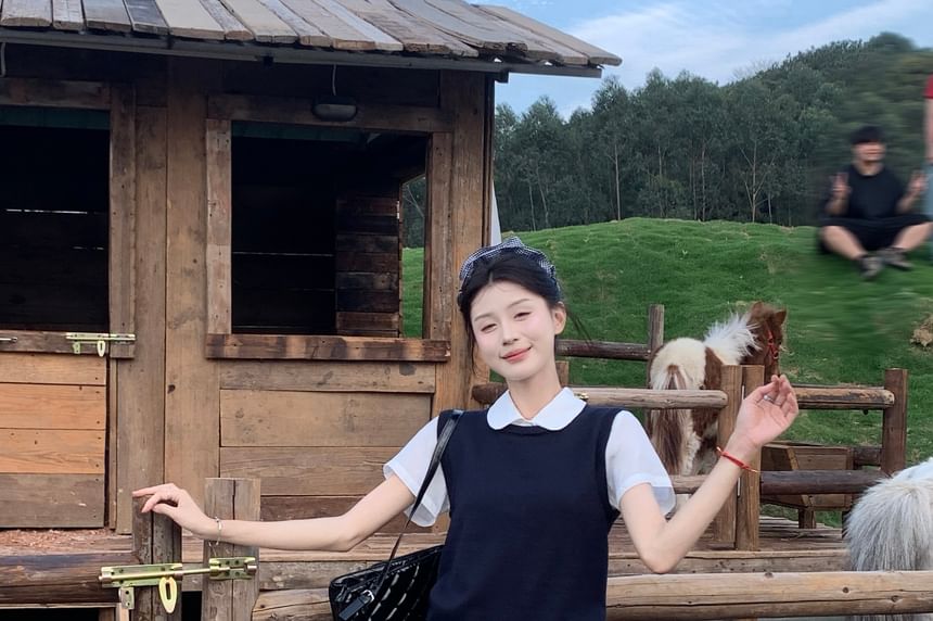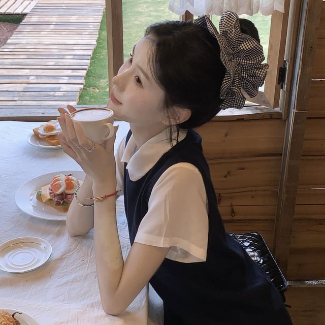 Short Sleeve Collared Plain Shirt / Round Neck Plain Sweater Vest / High Waist Plain Mini A-Line Skirt