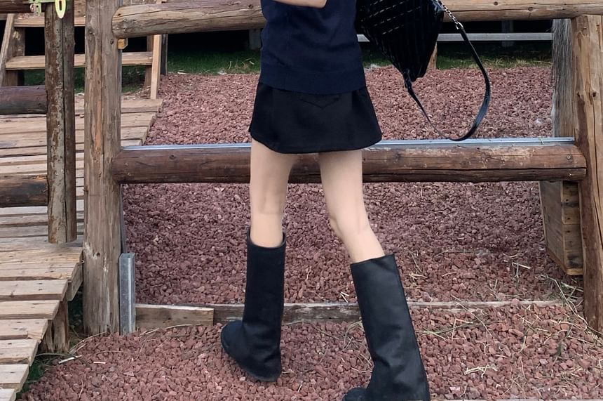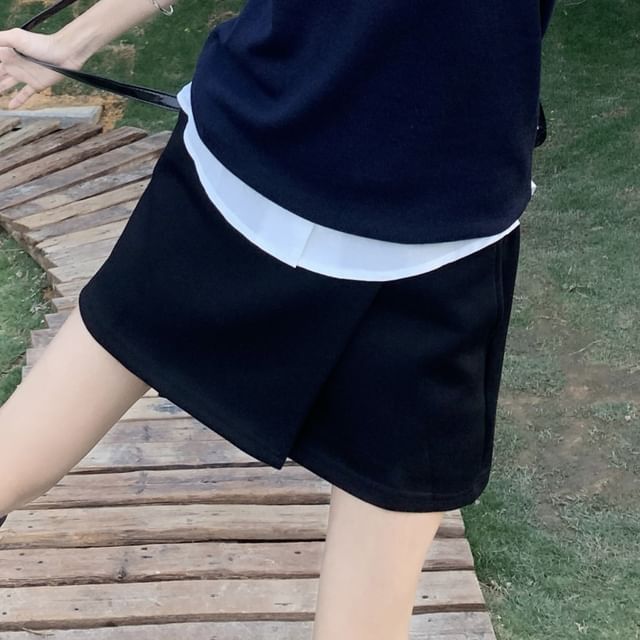 Plain Mini Skirt Sweater / Short Sleeve High Neck Waist A-Line Collared Vest Shirt Round
