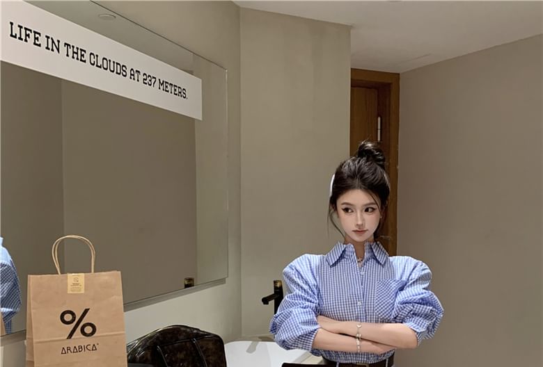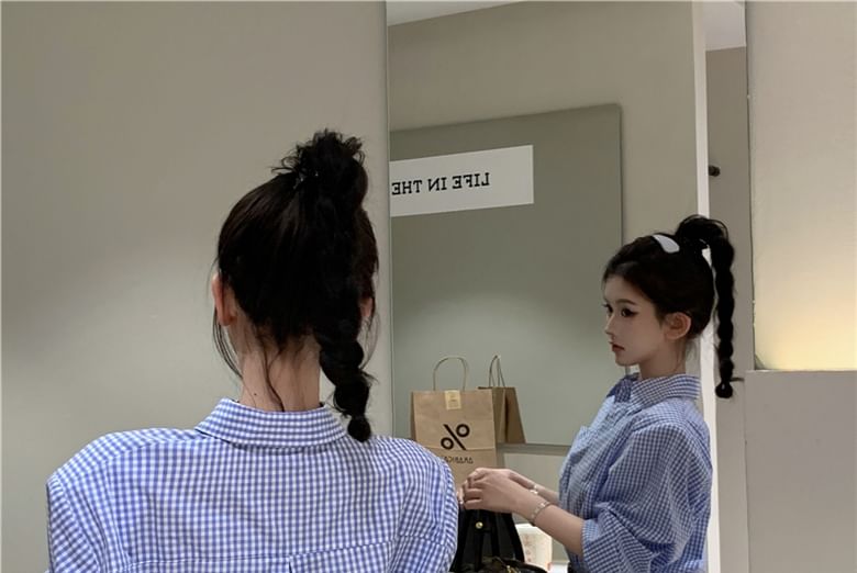 Pocket Henley Front Mini Plaid Shirt Pleated Long-Sleeve Hem Dress