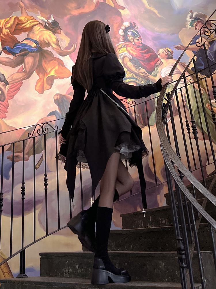 Lolita Puff Sleeve Collared Plain Cutout Ruffle Lace Up Mini A-Line Dress / Chain / Crinoline / Set
