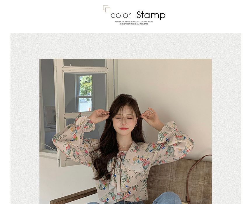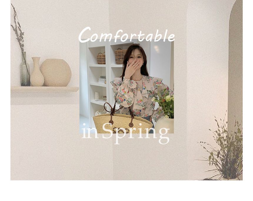 Puff-Sleeve Floral Print Ruffled Drawstring Blouse