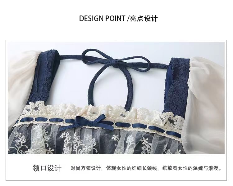 Puff-Sleeve Flower Embroidered Lace Trim Midi A-Line Dress