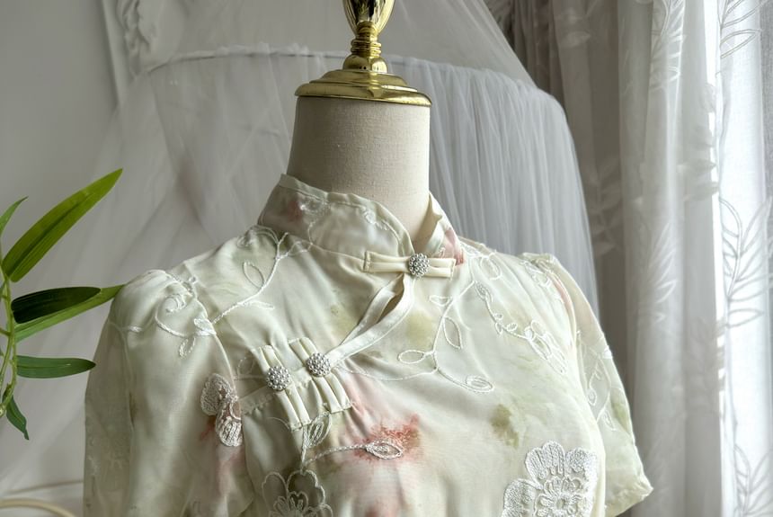 Puff-Sleeve Mock Neck Floral Maxi A-Line Dress