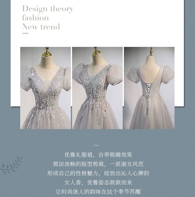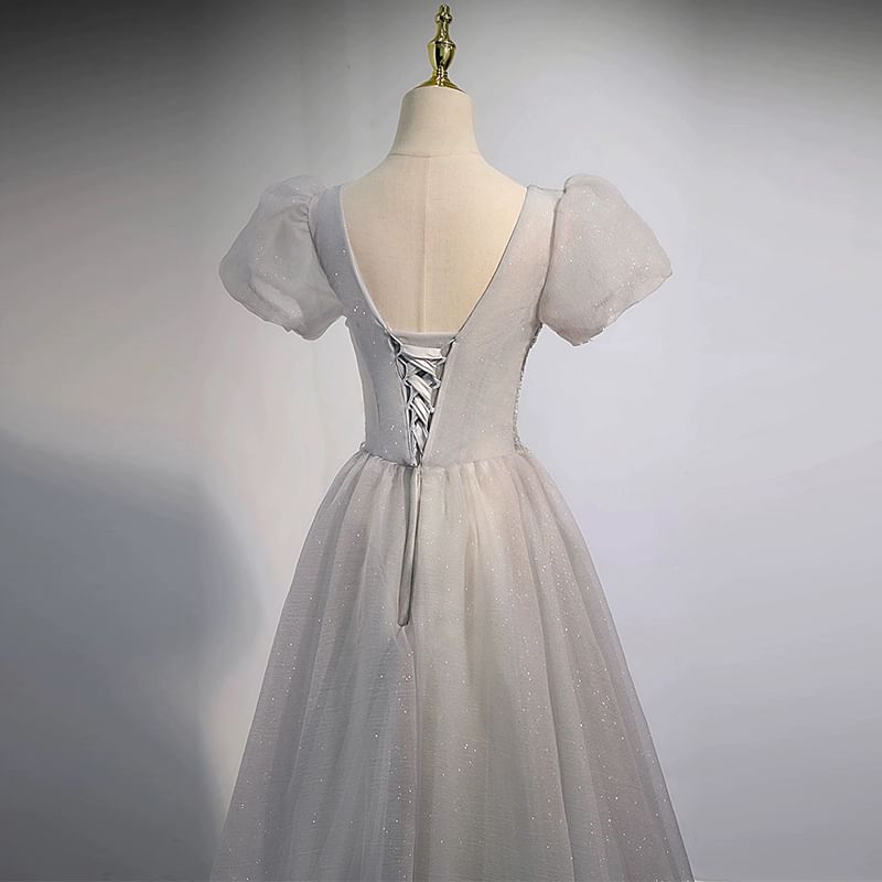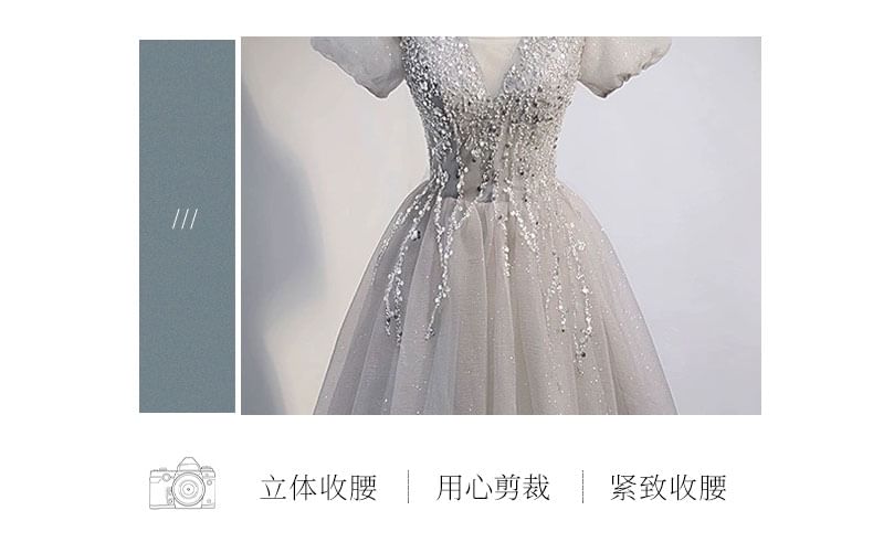 Puff-Sleeve V-Neck Plain Sequin Open Back Mesh A-Line Evening Gown