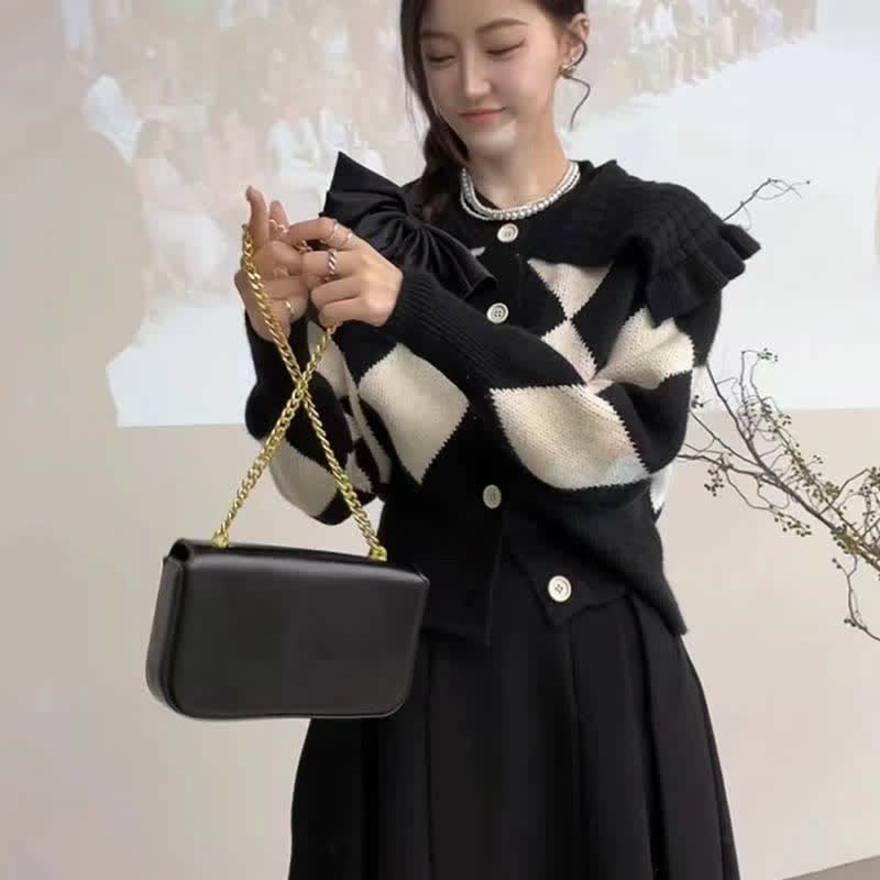 Rhombus Print Sweater Slip Dress Skirt Pants Set