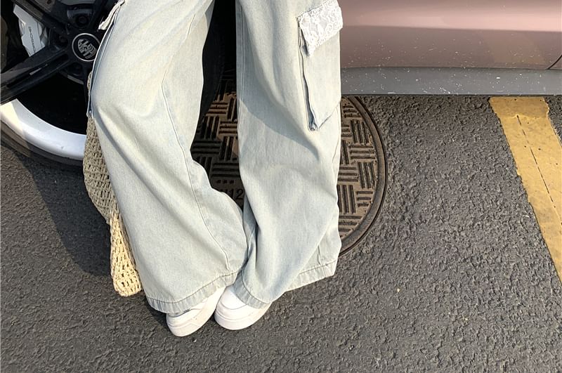 Rise Low Crop Lace Leg Button-Up Trim Jeans Cargo Wide Top / Camisole Washed Panel