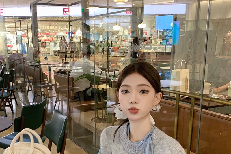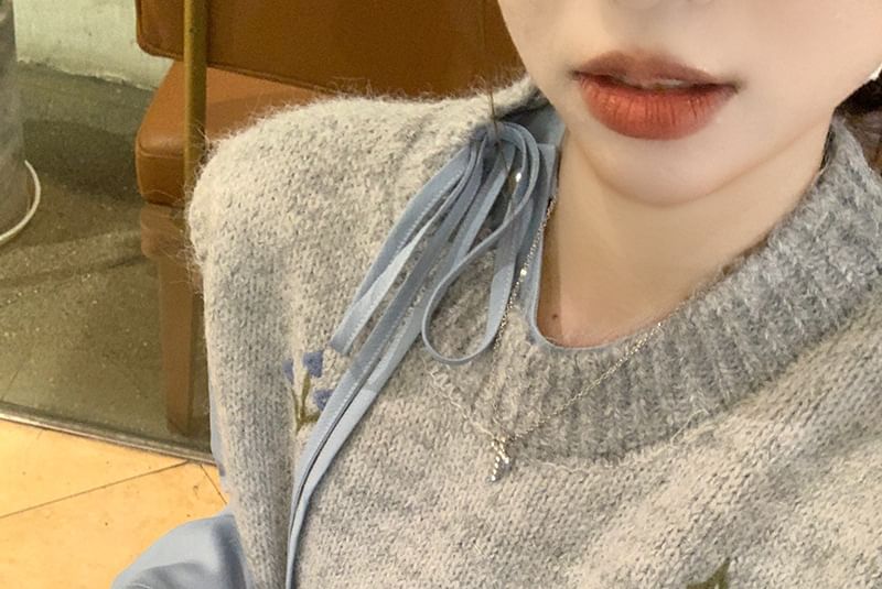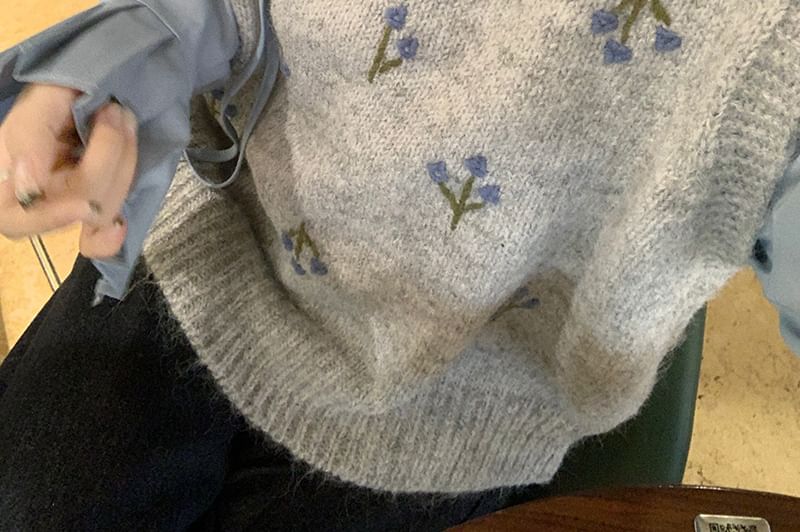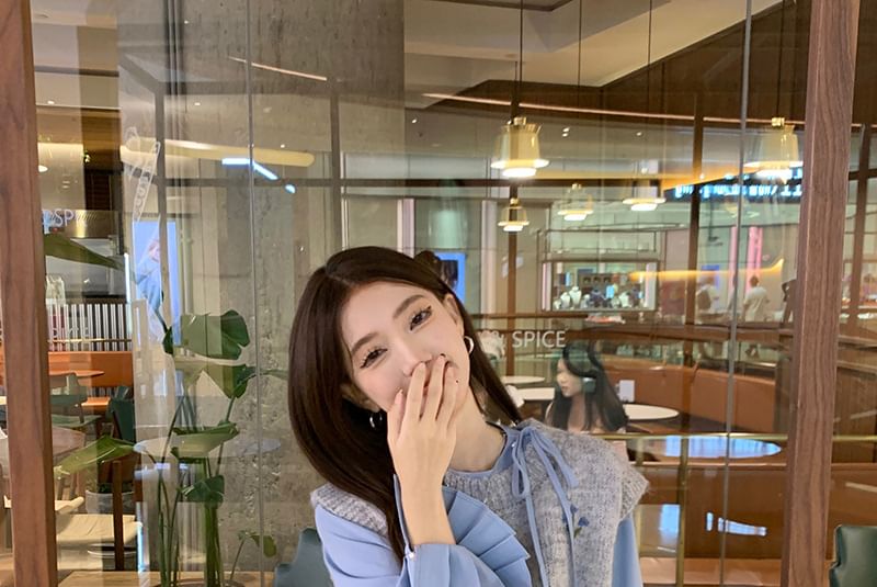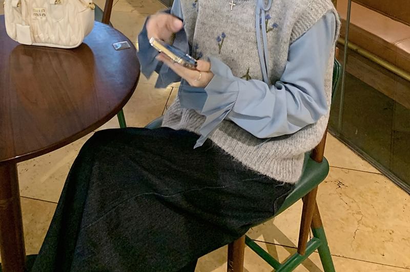 Round Neck Floral Sweater Vest / Long-Sleeve Plain Ruffle Trim Blouse