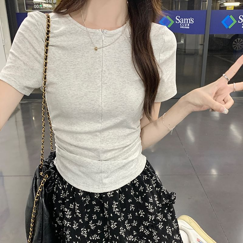 Short-Sleeve Round Neck Ruched Half-Zip Slim Fit T-Shirt