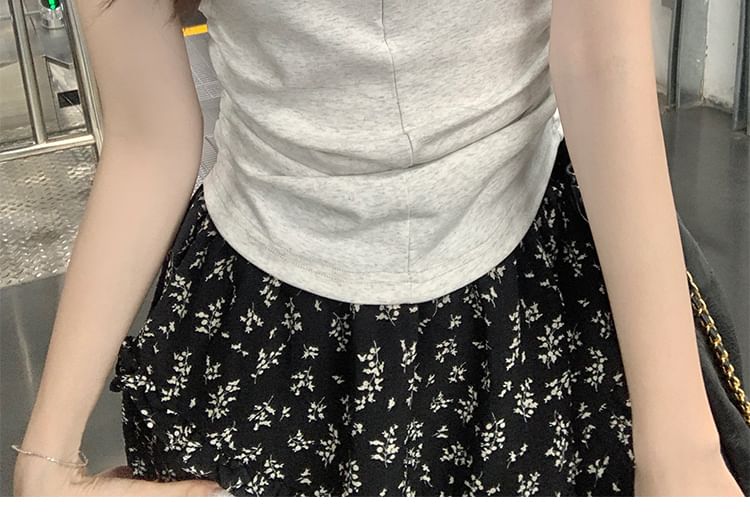 Round T-Shirt Slim Half-Zip Fit Ruched Neck Short-Sleeve