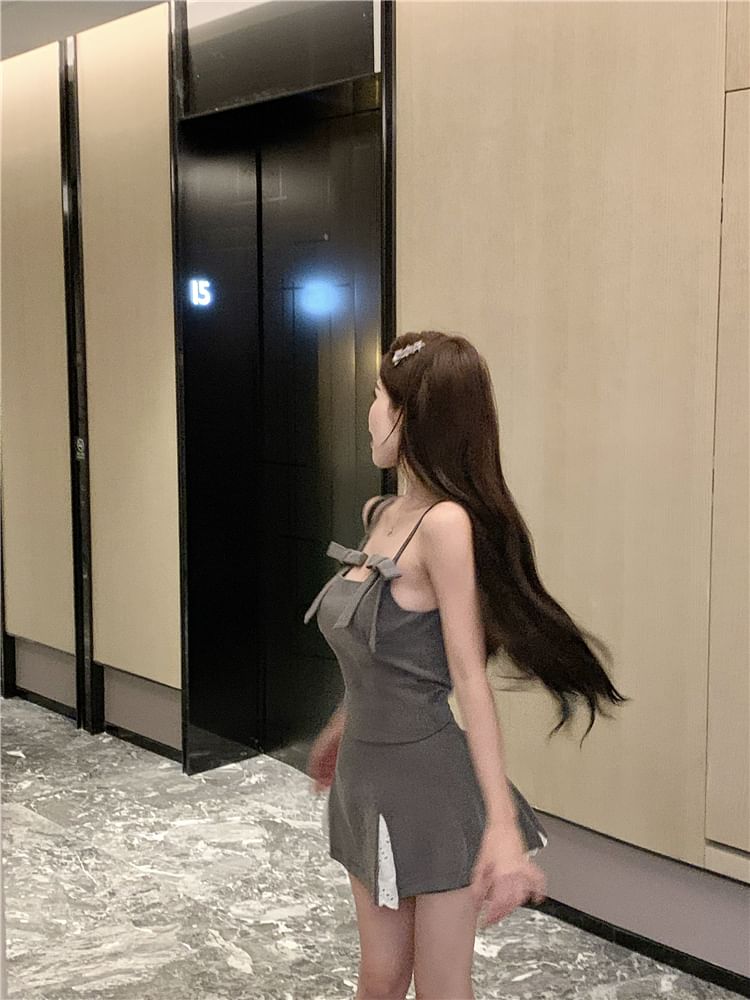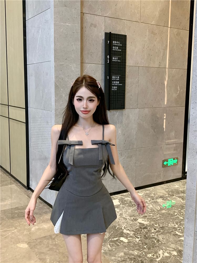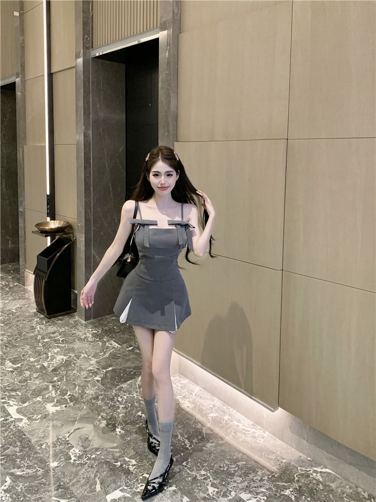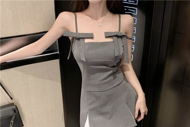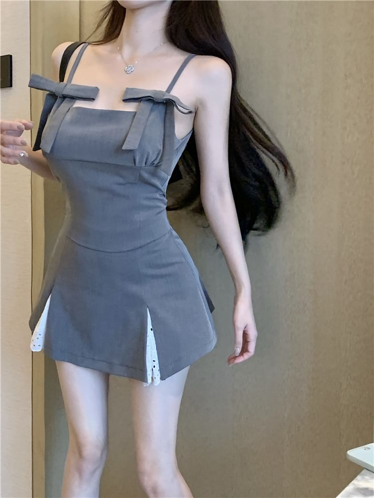 Scoop Neck Plain Bow Accent Crop Cami Top / High Rise Lace Panel Mini A
