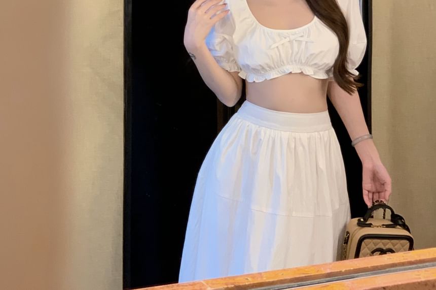 Sleeveless Scoop Neck Plain Bow Frill Crop Blouse / High Rise Maxi A-Line Skirt