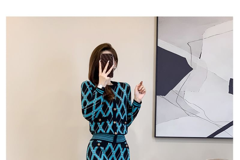 Set: Patterned Sweater + High Waist Knit Mini Straight Skirt