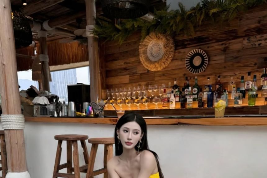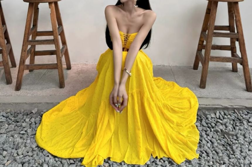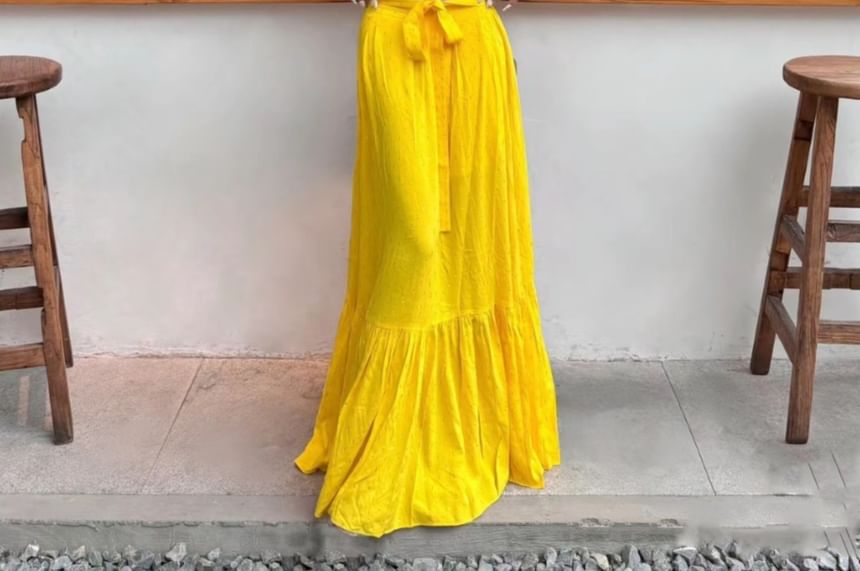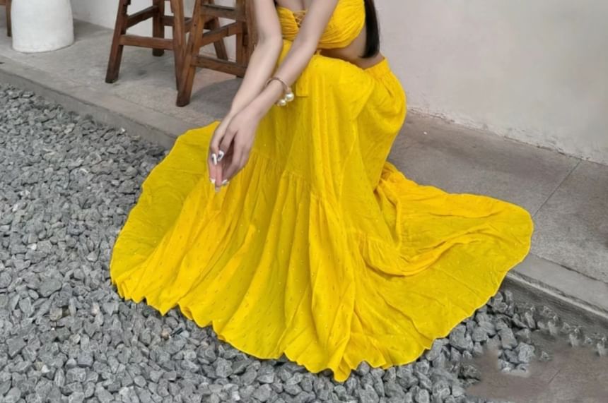 Set: Plain Ruched Crop Tube Top + Mid Rise Plain Maxi A-Line Skirt