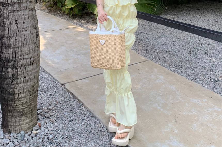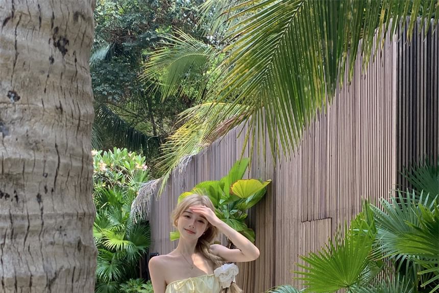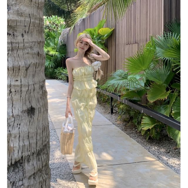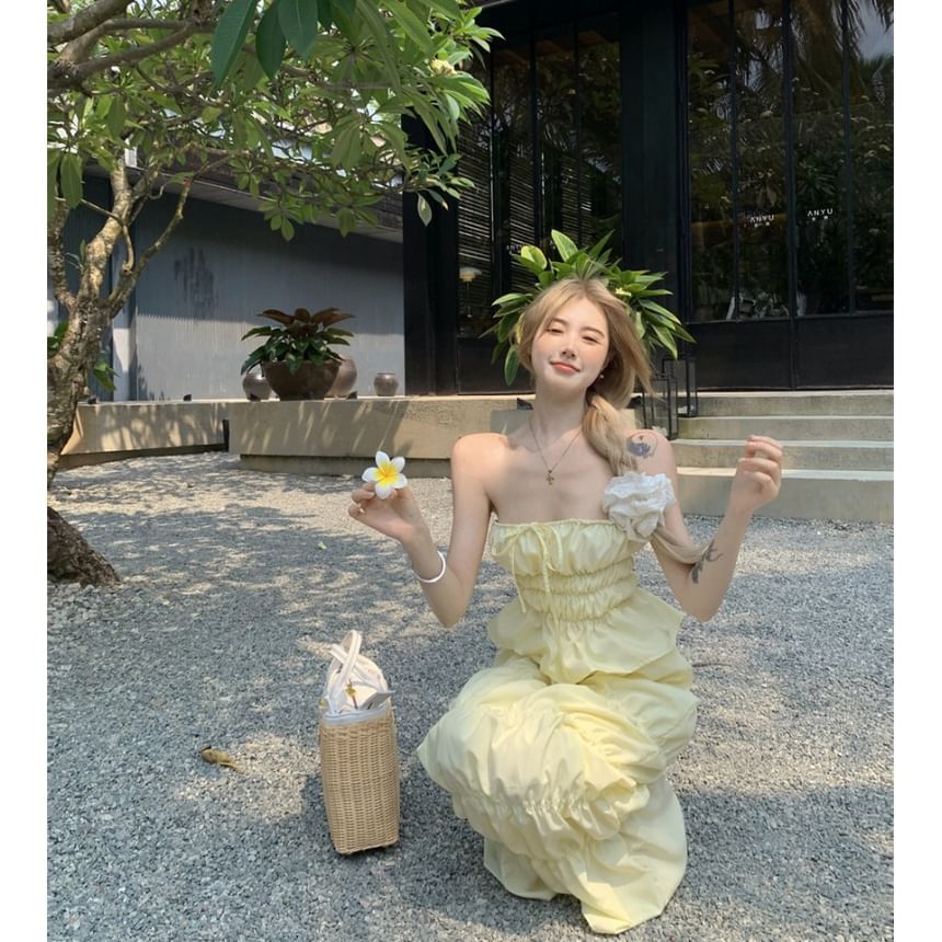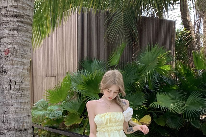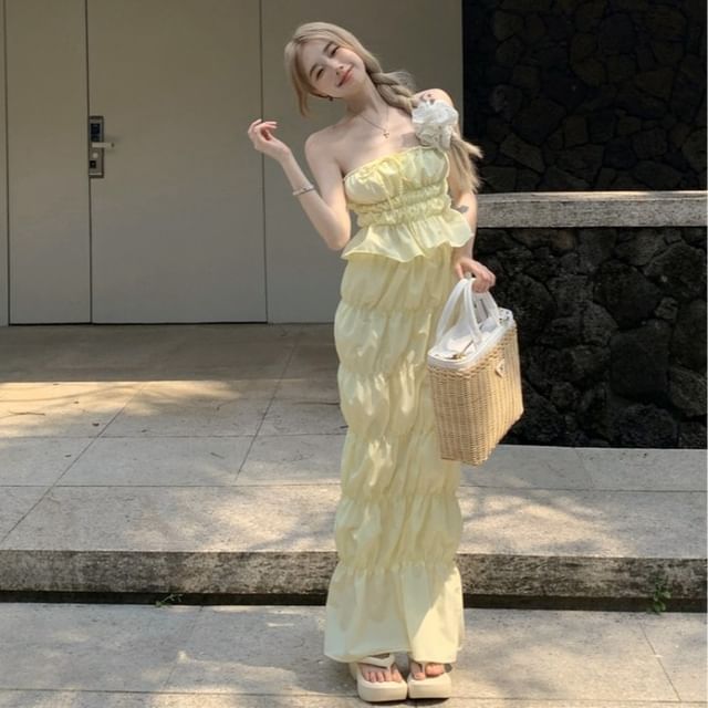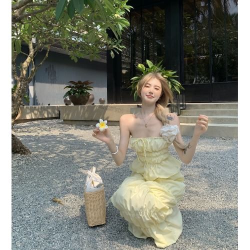 Set: Plain Shirred Drawstring Tube Top + High Waist Midi A-Line Skirt