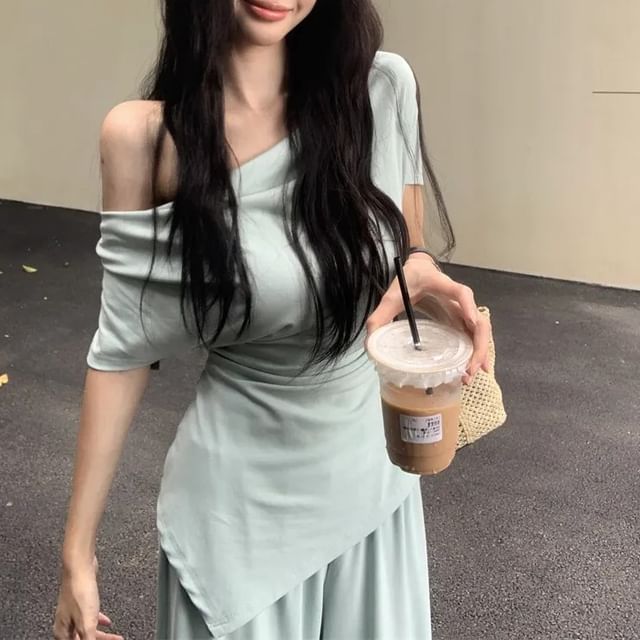 Set: Short Sleeve Cold-Shoulder Plain Asymmetric-Hem Slim-Fit Top + High Rise Loose-Fit Pants