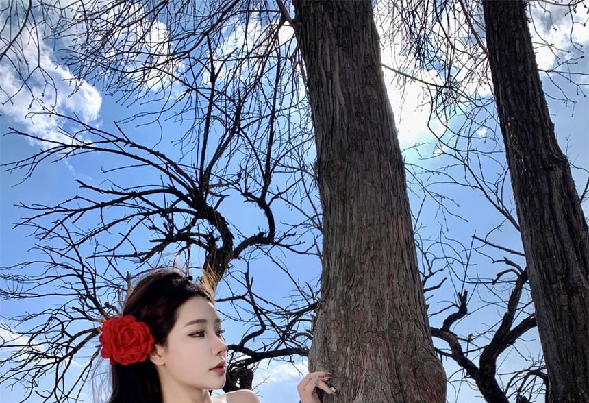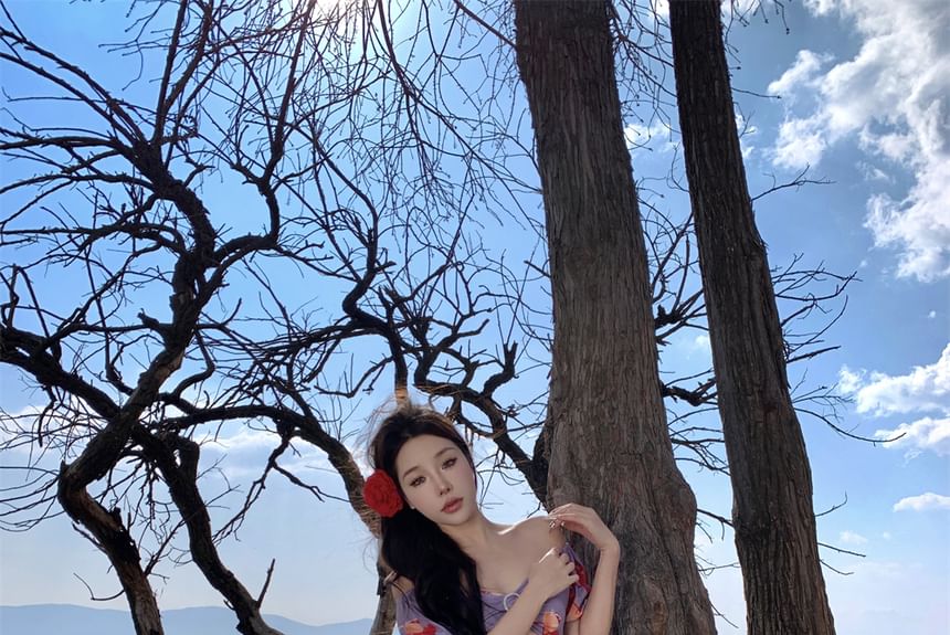 Set: Short-Sleeve Off-Shoulder Floral Crop Top + Mid Rise Maxi Pencil Skirt