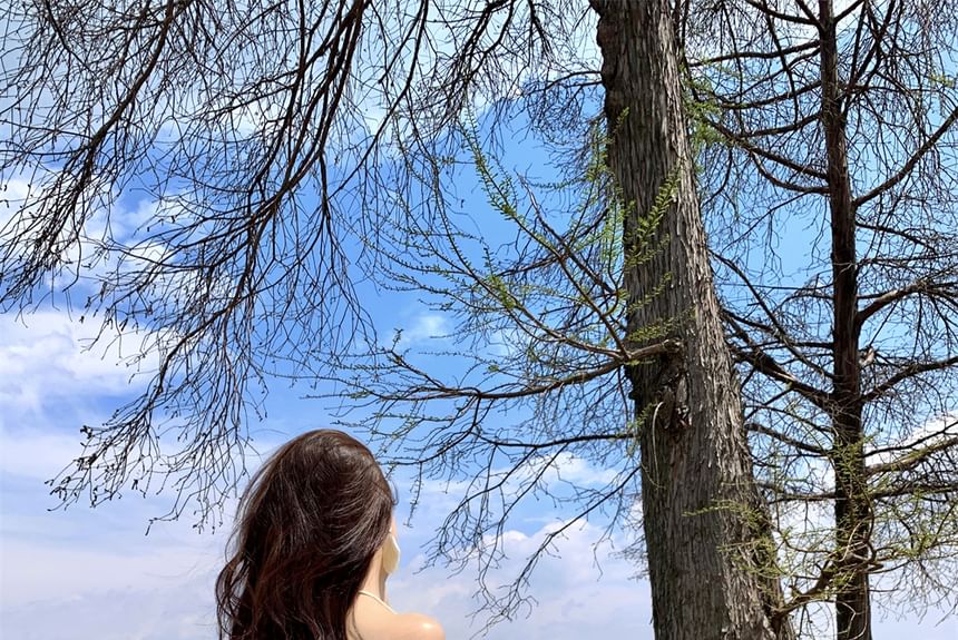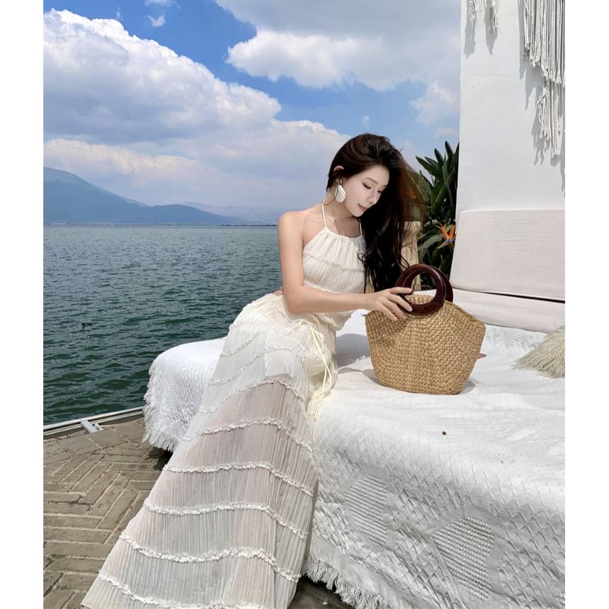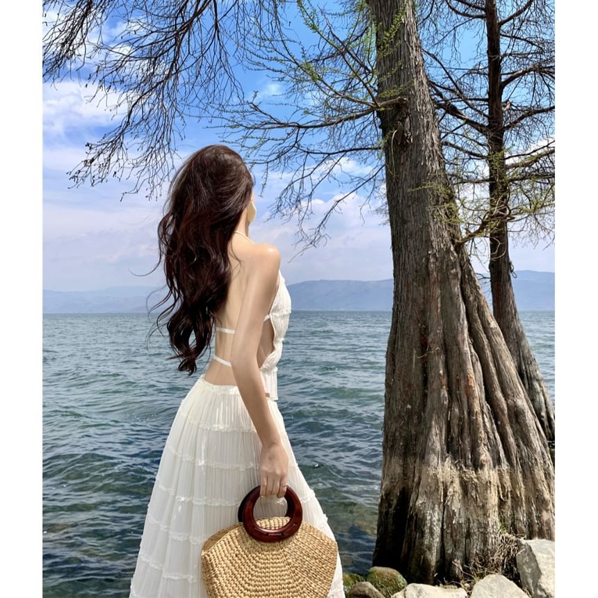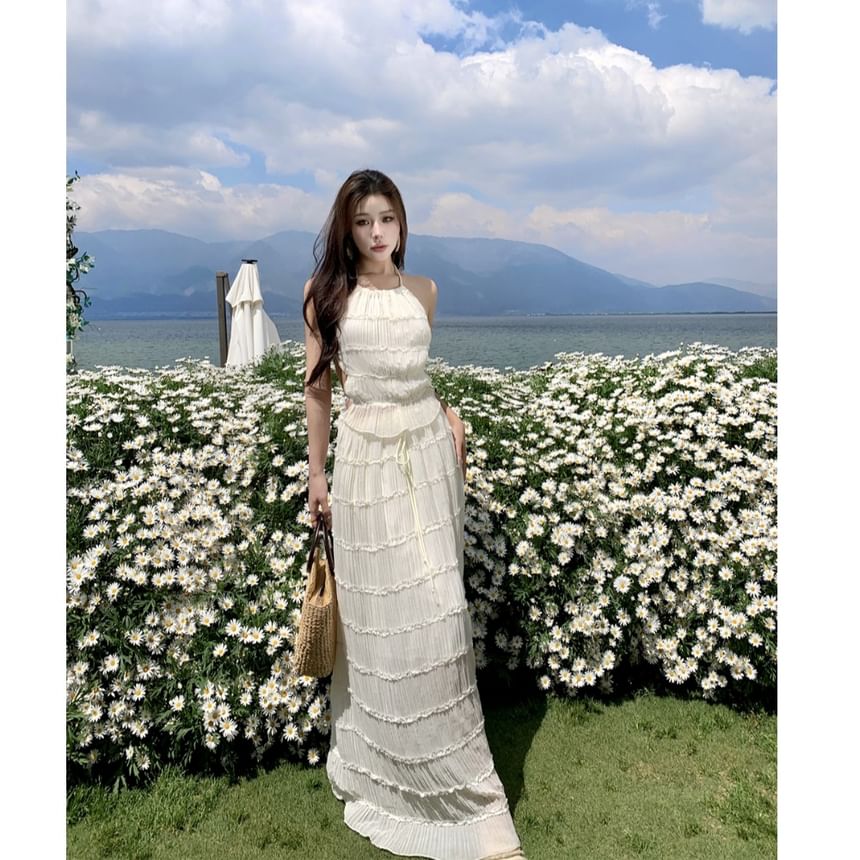 Set: Striped Halter Top + Mid Waist Maxi A-Line Skirt