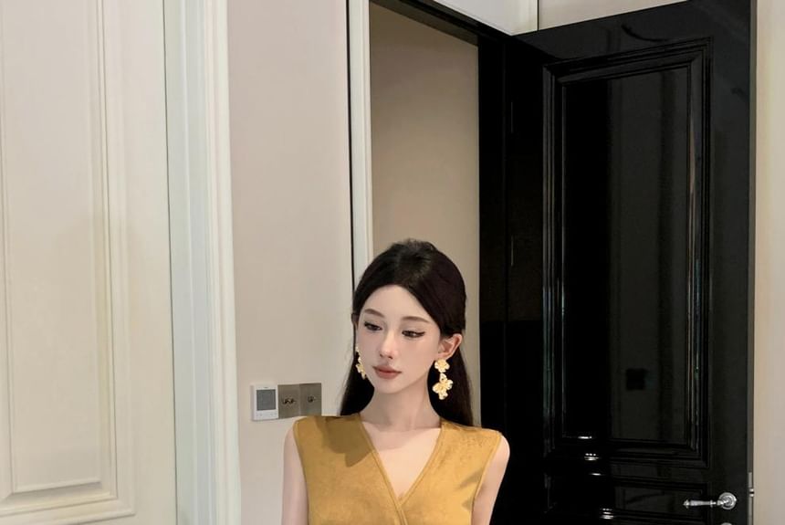 Sleeveless V-Neck Plain Ruched Slit Maxi Sheath Wrap Dress