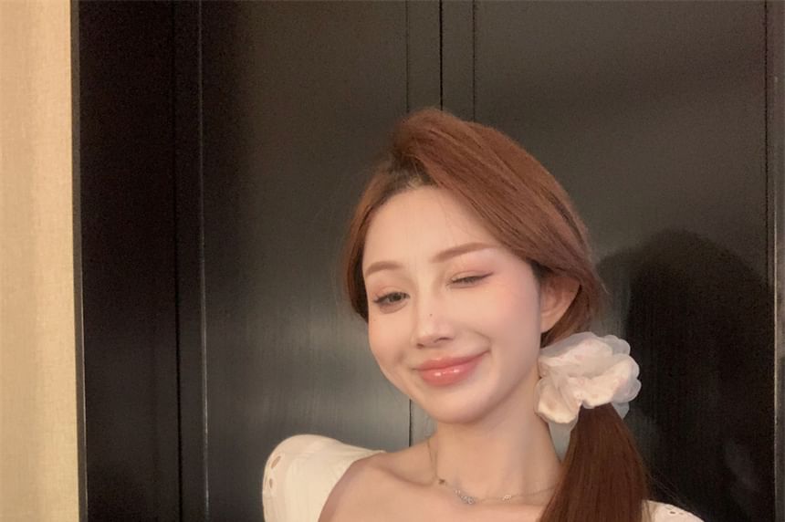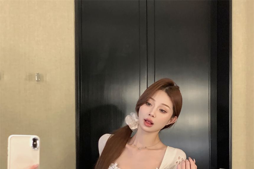 Short-Sleeve Square-Neck Floral Trim Mini A-Line Dress